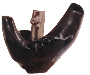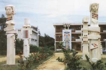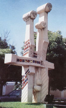 Il y a une continuité en dimension dans les sculptures de Paul Ahyi. Il y a de même une diversité de matériaux Pierre, Ciment Blanc, Bois, Métal, même les céramiques sont dans bien des cas de véritables sculptures. L'artiste a cependant un grand souci de stabilité structurelle de ses oeuvres, par conséquent les plus grandes oeuvres sont uniquement en Ciment renforcé et les proportions sont calculées à cet effet. Les sculptures de Paul Ahyi, comme ses oeuvres graphiques parlent de l'Etre Humain, de l'Homme noir, de l'Afrique et de ses Cultures.Ci-contre, 'Forces Fécondes' fait partie des Oeuvres de grandes dimensions, imposantes par leur présence massive.